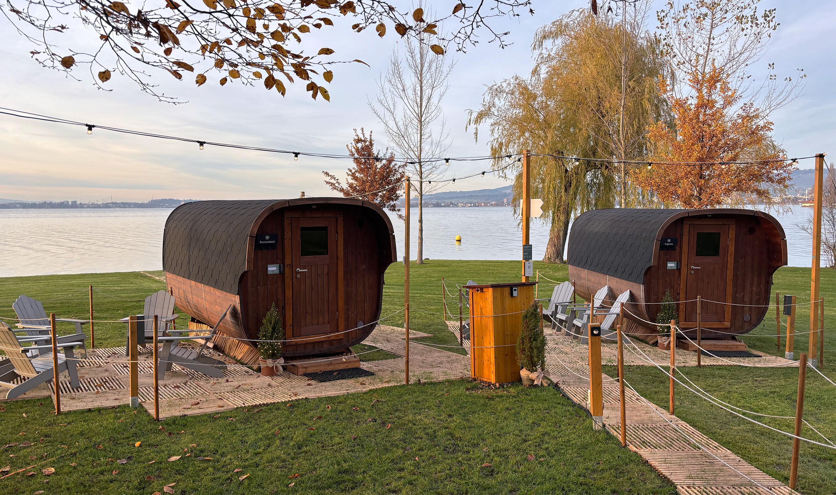 Unsere Panoramasaunas aus Holz sind identisch und bieten Platz für jeweils bis zu 6 Personen.