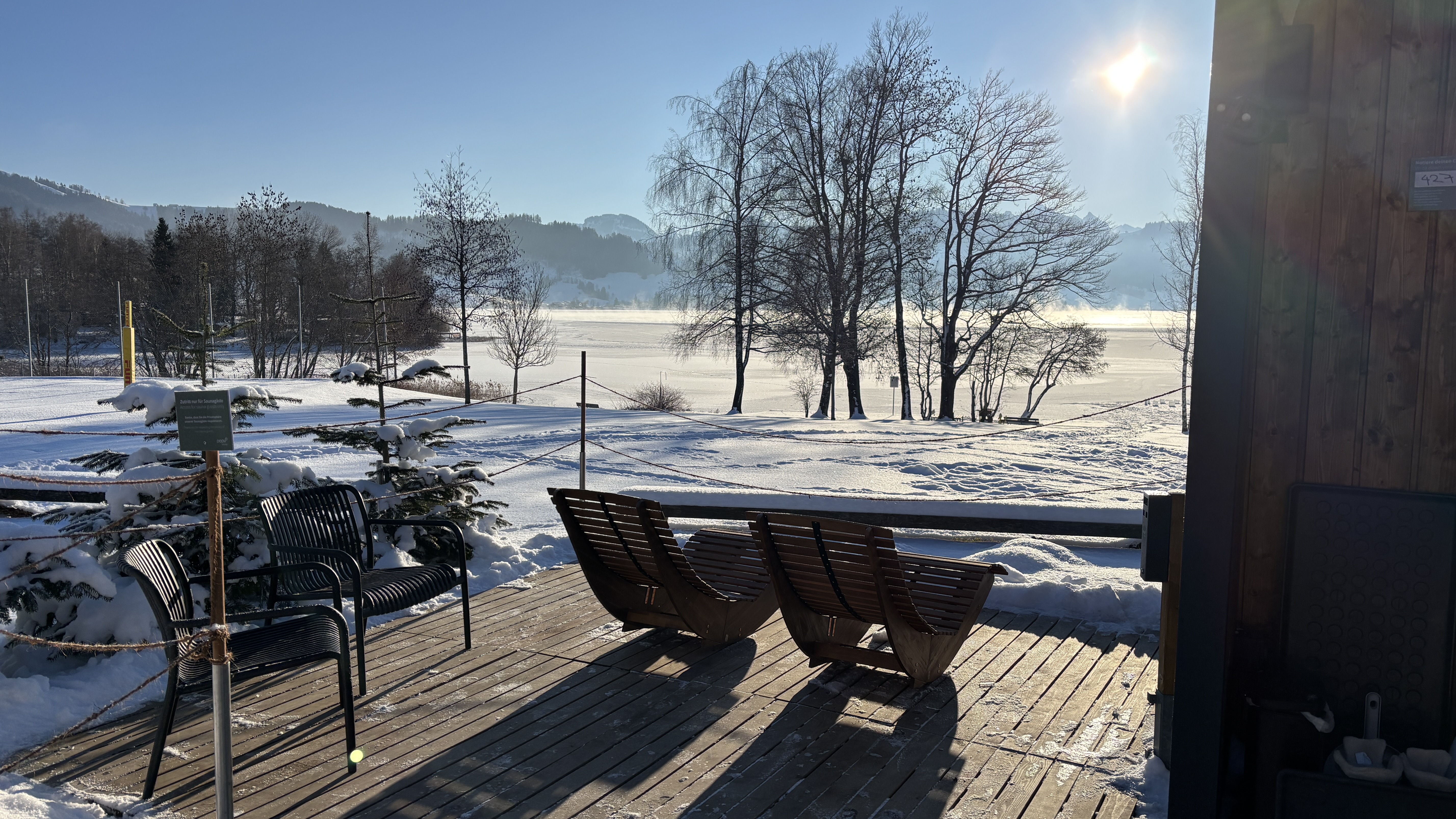 Die Sauna ist auf dem Sitzplatz des Restaurants (geschlossen) platziert und steht je nach Wasserstand ca. 100 Meter vom Seeufer entfernt.