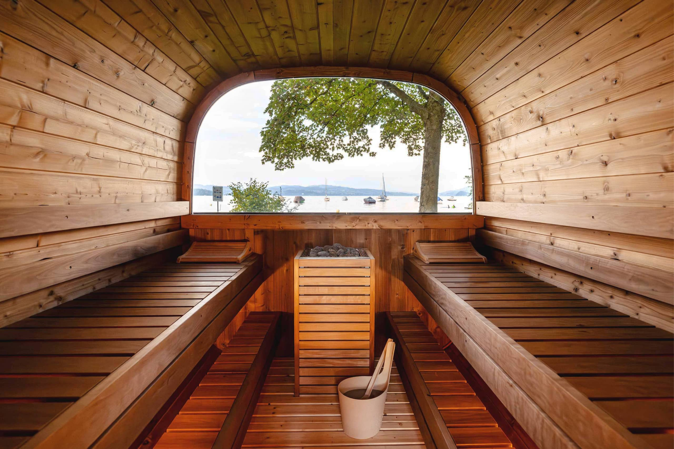 The four-metre-long wooden saunas are identically equipped and have a spacious sauna room with panoramic windows and a smaller anteroom that serves as a changing or relaxation room.